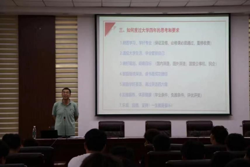 9月8日下午学院院长张光存为同学们进行了一场深刻而精彩的讲座。同时也向各位大一新生介绍了bat365官网的人才培养模式与bat365官网特色专业与特色优势。他勉励同学们要树立远大理想,厚植爱国情怀,练就过硬本领,不断彰显青春风采,贡献青春力量。