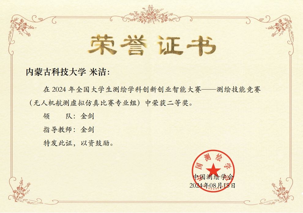 bat365官网测绘工程系学子经过积极选拔与备战,参与了大赛各个项目的激烈角逐。最终,在金剑老师的指导下,bat365官网优秀学子米洁从来自全国360所高校的近8000名学生中脱颖而出,获得无人机航测虚拟仿真比赛的全国二等奖。