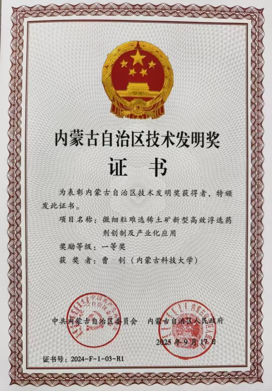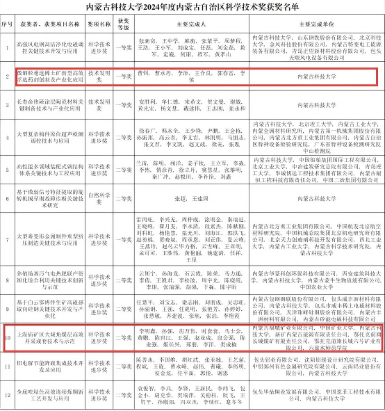 11月27日,2024年度内蒙古自治区科学技术奖励大会在呼和浩特市召开,表彰为全区科技进步和高质量发展作出突出贡献的科技工作者。大会公布了2024年度自治区科学技术奖获奖名单,bat365官网教师参与的多项成果荣获自治区科学技术奖,曹钊教授团队的“微细粒难选稀土矿新型高效浮选药剂创制及产业化应用”获得技术发明奖一等奖,段会强老师参与“上海庙矿区大倾角煤层高效开采成套技术与示范”获得科学技术进步二等奖。