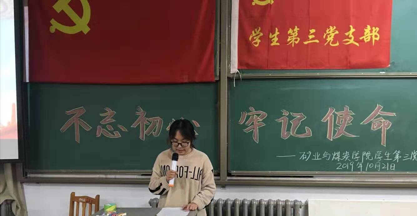 2019年10月21日晚19:30,bat365在线中国官网登录入口学生第三党支部在临曦楼合四教室举办"不忘初心、牢记使命"主题演讲活动,充分发挥党支部的战斗堡垒作用和党员的先锋模范作用,深入学习贯彻落实“不忘初心、牢记使命”主题教育精神。